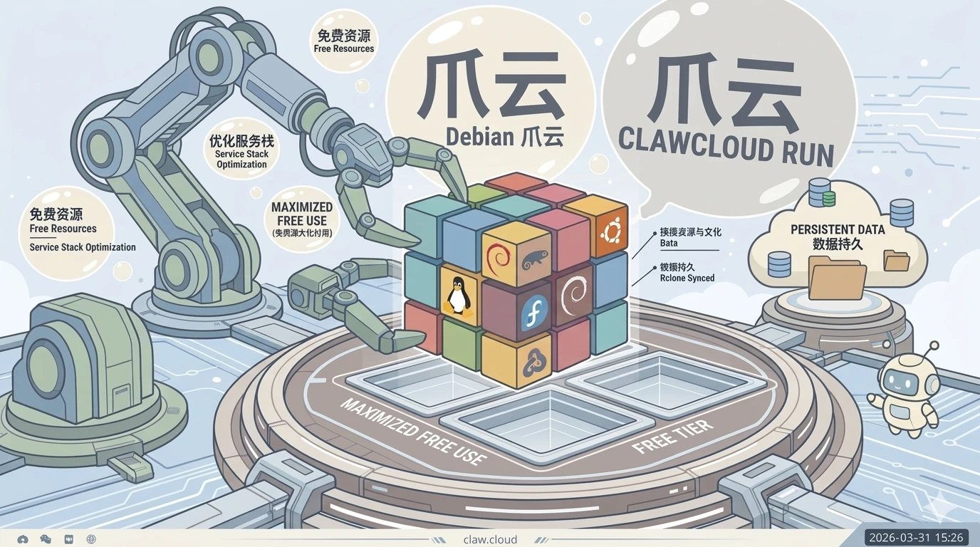关于爪云 (ClawCloud) 官方地址: https://ap-northeast-1.run.claw.cloud/signin 使用注册时间超过 180 天 的 GitHub 账号登录,每月可获赠 $5 额度 用于部署容器。虽然额度不多,但如果合理分配资源,完全可以。 痛点 名额限制: 免费计划最多只能部署 4 个 容器。如果分开部署 OpenList、Twikoo、Debian、图床等服务,名额很快就会用尽。 数据风险: 容器偶尔会出现停止运行的情况,且存在数据丢失风险。 为了突破名额限制并解决备份问题,我们可以