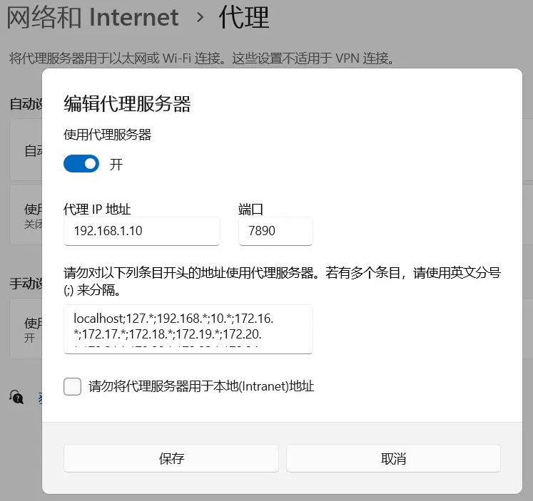 - 电脑连接手机热点后,打开设置>网络和Internet>代理>编辑代理服务器,填入手机 ip 和端口,如图