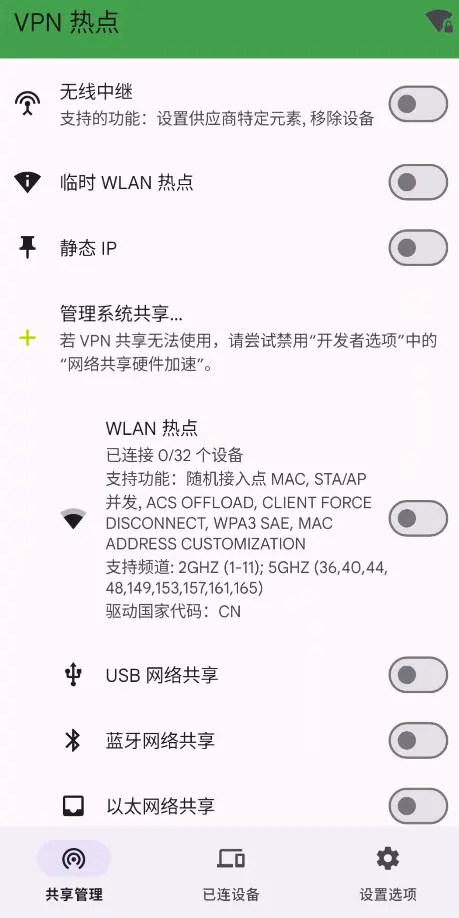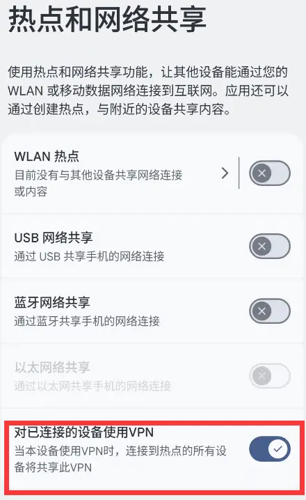 - 如果你不打算刷类原生,国产原版系统大都是没有热点共享 vpn 功能的。需要用到 VPN Hotspot 这个软件,可以实现热点共享 vpn 功能。谷歌商店有下。