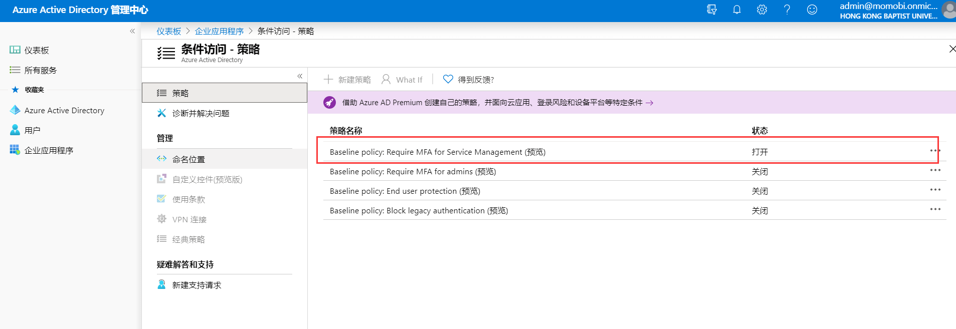 2020-02-20 2020-02-20 2020-02-20 WARNING 问题 office 365账户有时候不知道怎么微软就强制给你启用了安全验证登录。 非让你下载一个Authenticator软件来辅助登录。 一开始以为是Azure多重身份验证结果关了,没用。 然后联系了客服,客服给出了解决方法。 打开管理后台 点击Azure Active Directory 依次点击 把Azure 资源的访问管理关了。一般就行了 这样你再退出,重新登录就好了 没效果再考虑设置下面的,有效果就不用管了 ==================== 如果还不行再设置这里, 2023/1/31日更新 微软更新了界面布局,新的路径为: 前一篇 rclone配置google drive上传教程 后一篇 Linux下deluge安装+实现bt/pt远程离线下载